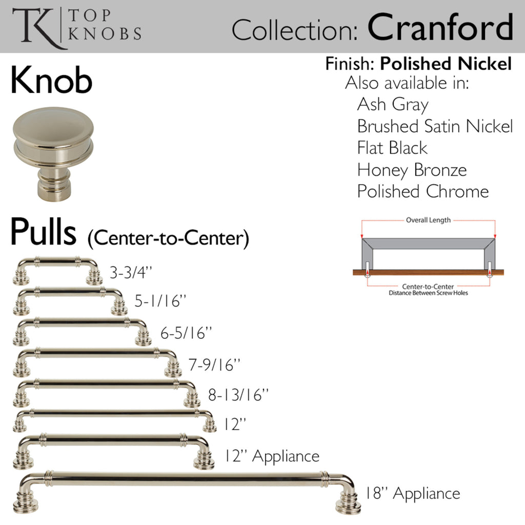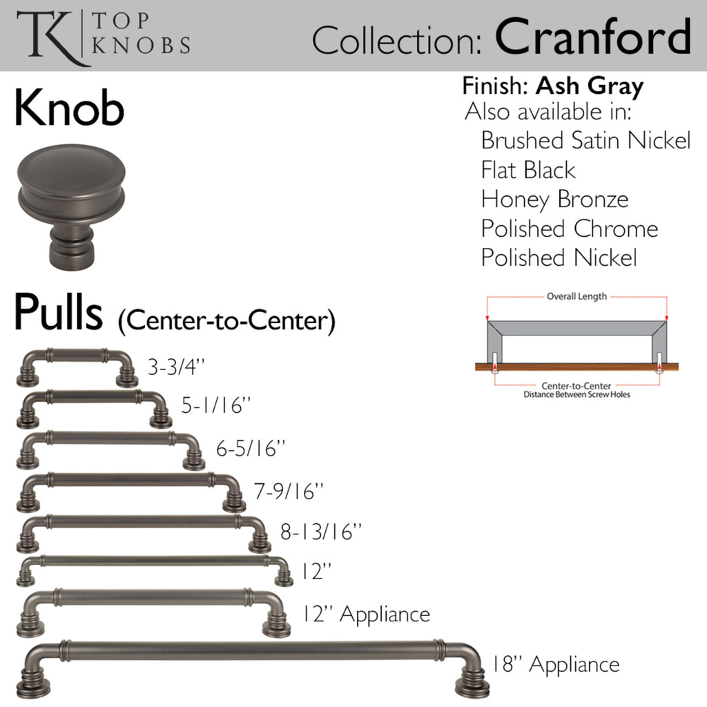 The Cranford series offers classic designs with a timeless twist by uniting banded detailing with wide feet to achieve a look that radiates beauty and strength. Pair with coordinating cylindrical knobs to imbue any kitchen or bath space with a perfect touch of grand-millennial style. From kitchens and bathrooms to laundry rooms and home offices, Top Knobs decorative cabinet hardware continues to shape home design. Top Knobs offers the most extensive line of premium cabinet hardware allowing the creative freedom to complete the perfect look. Leave the finishing touch to the brand designers trust!, The Cranford series offers classic designs with a timeless twist by uniting banded detailing with wide feet to achieve a look that radiates beauty and strength. Pair with coordinating cylindrical knobs to imbue any kitchen or bath space with a perfect touch of grand-millennial style. From kitchens and bathrooms to laundry rooms and home offices, Top Knobs decorative cabinet hardware continues to shape home design. Top Knobs offers the most extensive line of premium cabinet hardware allowing the creative freedom to complete the perfect look. Leave the finishing touch to the brand designers trust!, Complete suite with coordinating knobs available, If you like the way the Cranford pull looks, you'll love the way it feels!, Complete suite with coordinating knobs available, If you like the way the Cranford pull looks, you'll love the way it feels!, Finishes that will withstand the rigors of daily use, Buy with confidence knowing Top Knobs offers a Lifetime Warranty, , , , ,