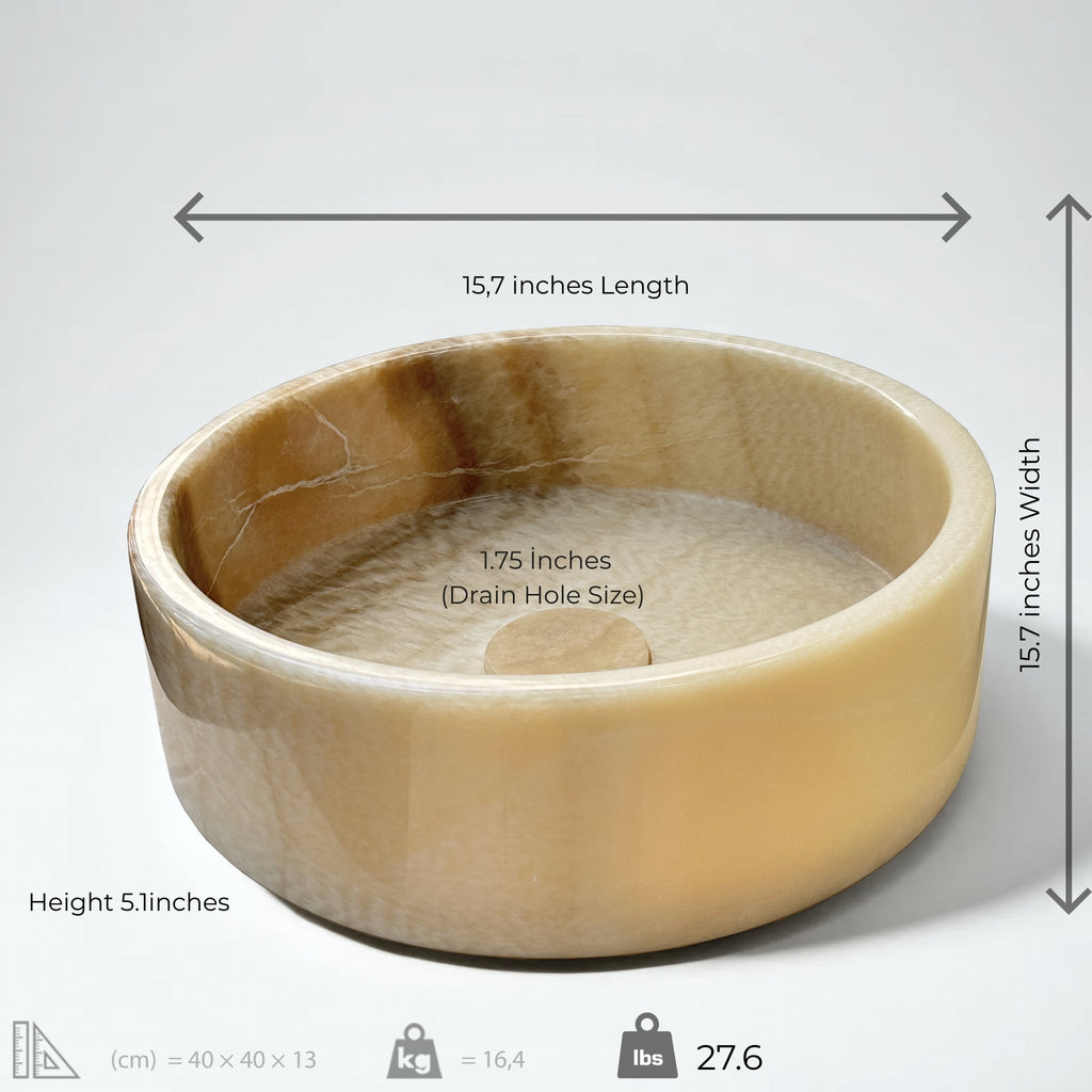 Elevate your bathroom to a new level of sophistication with the Honey Onyx Marble Vessel Sink. Handcrafted from 100% natural honey onyx, each sink showcases the stone’s warm golden hues and intricate veining, making every piece truly one-of-a-kind. The polished, translucent surface creates a soft glow under light, adding an elegant ambiance that complements both modern and classic bathroom styles.
