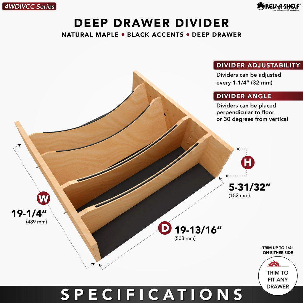 Are deep drawers driving you crazy? You are not alone! The 4WDIVCC Craftsman Collection Adjustable Deep Drawer Divider Inserts from Rev-A-Shelf® are sure to add organization without sacrificing style. Available in multiple trimmable sizes, these beautiful inserts feature solid maple construction and recessed black wire accents for a modern and refined appearance. The unique curved design seamlessly complements the rest of the Craftsman Collection while adding both visual interest and effortless access to the contents of the drawer. Installs in seconds with just four screws and includes up to six removable, adjustable dividers that can be positioned either at an angle or vertically, allowing you to create a truly customized organization solution.