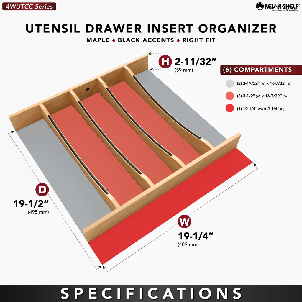 The 4WUTCC Series Craftsman Collection Utensil Tray Inserts by Rev-A-Shelf® offer a stylish solution for organizing your kitchen tools. Crafted from solid maple, these inserts effortlessly complement most cabinetry, while the recessed matte black wire accents add a modern touch. The distinctive curved design enhances functionality by providing both visual interest and greater accessibility to the drawer contents. Each insert comes with a durable black non-skid vinyl mat to keep your items securely in place. Enjoy easy, drop-in installation with no tools or trimming required.