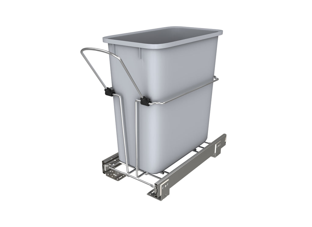 Ideal for tight areas like vanities, laundry rooms, and kitchens, our RUKD Series Chrome Waste Pullouts keep your small space tidy by tucking away your trash inside the cabinet. Designed with a durable chrome-plated welded wire frame and smooth ball-bearing slides, these reliable units are made for long-lasting use.. Included: (1) Gray 20 qt. waste container, (1) metal frame, (1) pair of slides, mounting hardware, and (1) clip on handle