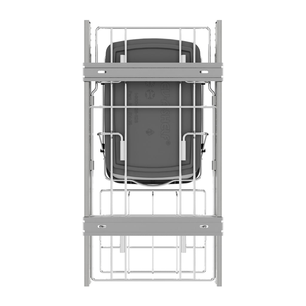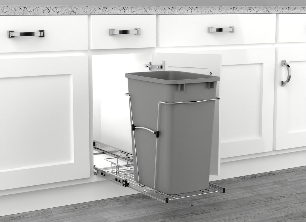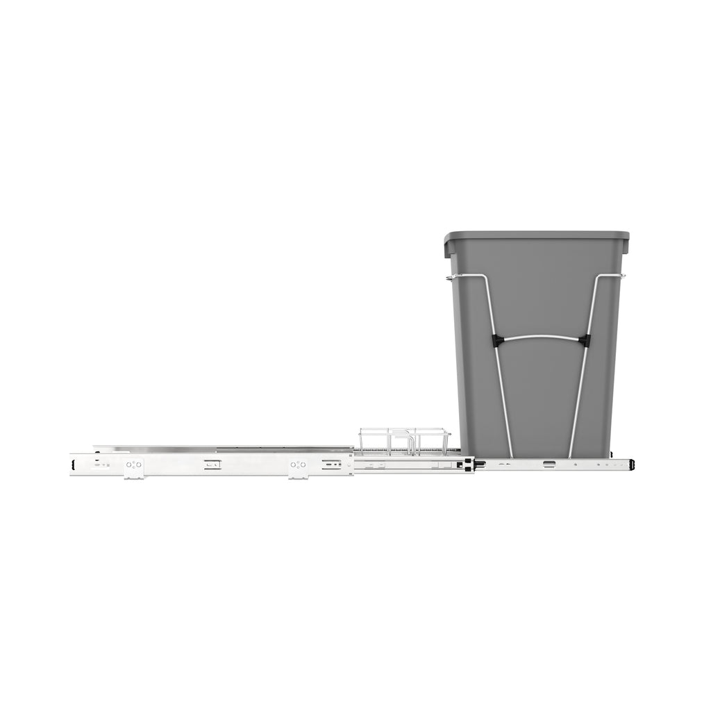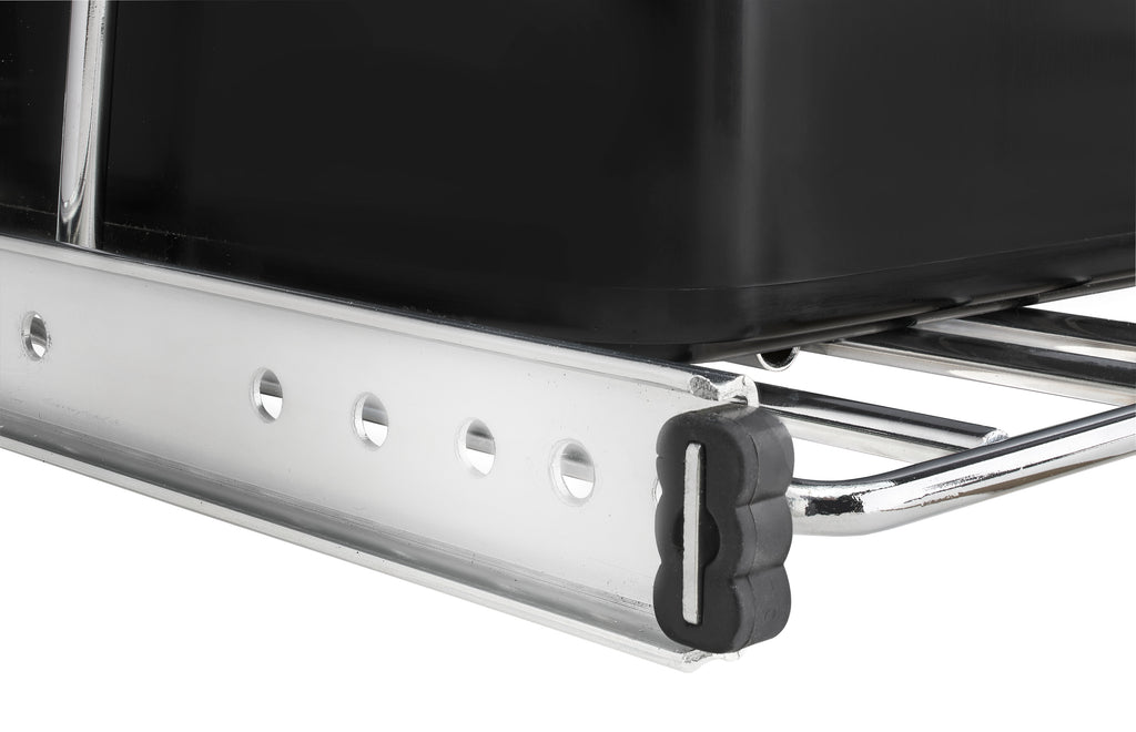 Rev-A-Shelf® knows waste containers better than anyone in our industry and the RV series is perfect for anyone wanting to replace your existing floor standing trash can and create more space in your kitchen. Available in chrome or white frames and offered in a variety widths and container sizes. All are easy to assemble and glide effortlessly on a sturdy slide system. Look for the optional door mount kit (5WB-DMKIT) or lids (27 qt., 32 qt., 35 qt. and 50 qt. only) that will surely finish your installation, but are not required for operation. Finally, the detachable storage basket is perfect for holding extra bags or even cleaning products.. Included: (1) Silver 35 qt. waste container, (1) metal frame, (1) pair of slides, and mounting hardware, (1) rear wire bakset
