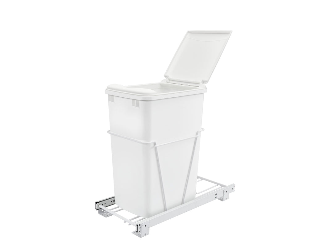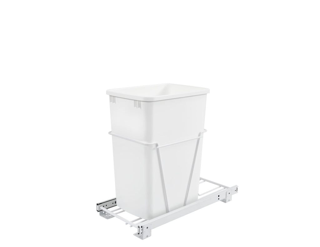 Rev-A-Shelf® knows waste containers better than anyone in our industry and the RV series is perfect for anyone wanting to replace your existing floor standing trash can and create more space in your kitchen. Available in chrome or white frames and offered in a variety widths and container sizes. All are easy to assemble and glide effortlessly on a sturdy slide system. Look for the optional door mount kit (5WB-DMKIT) and lids (27 qt., 32 qt., 35 qt. and 50 qt. only) that will surely finish your installation, but are not required for operation.. Included: (1) White 35 qt. waste container, (1) metal frame, (1) pair of slides, and mounting hardware
