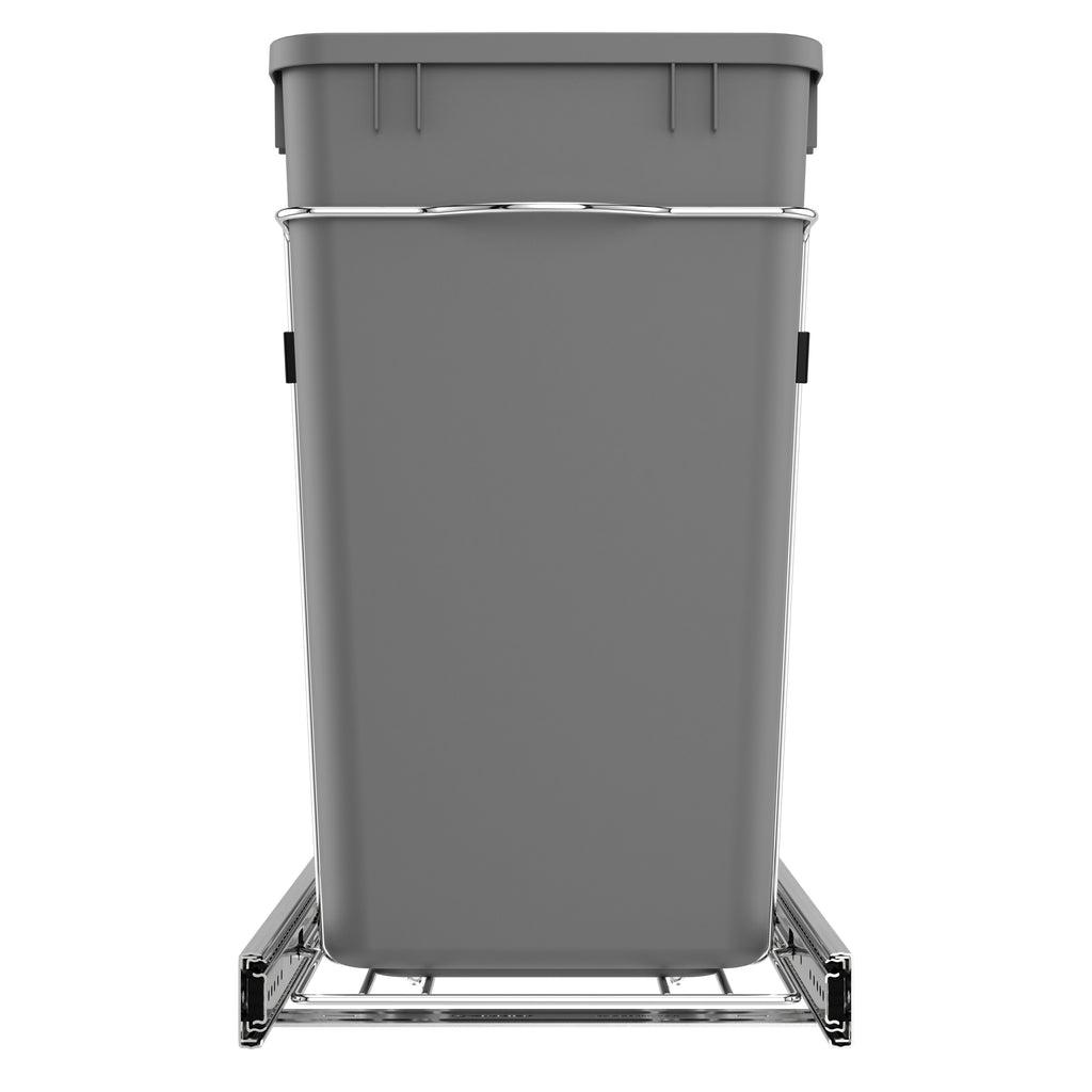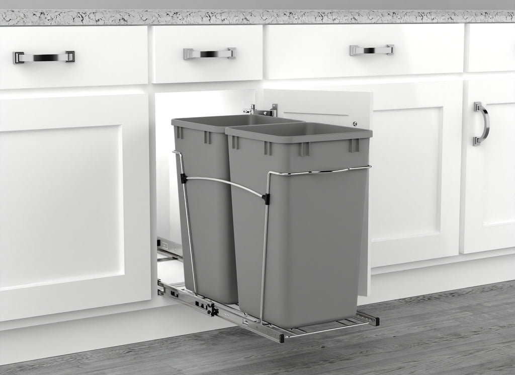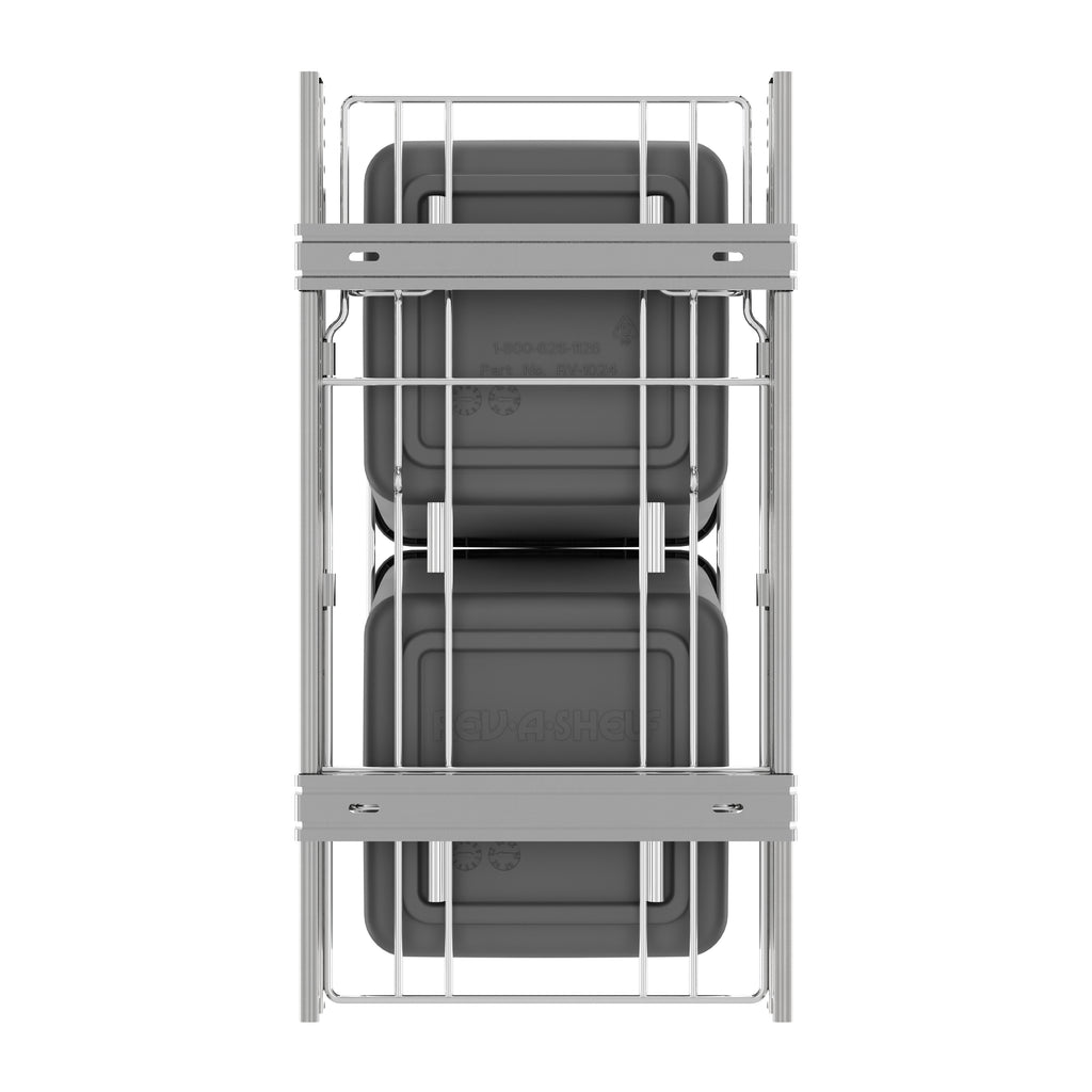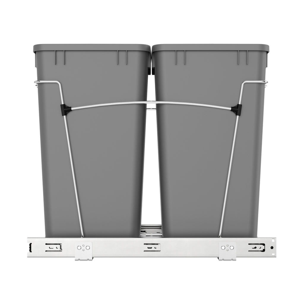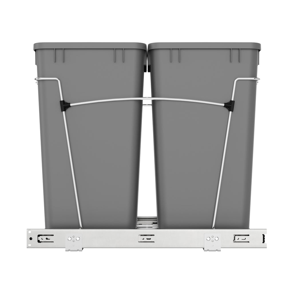 Rev-A-Shelf® knows waste containers better than anyone in our industry and the RV series is perfect for anyone wanting to replace your existing floor standing trash can and create more space in your kitchen. Available in chrome or white frames and offered in a variety widths and container sizes. All are easy to assemble and glide effortlessly on a sturdy slide system. Look for the optional door mount kit (5WB-DMKIT) or lids (27 qt., 32 qt., 35 qt. and 50 qt. only) that will surely finish your installation, but are not required for operation.. Included: (2) Silver 27 qt. waste containers, (1) metal frame, (1) pair of slides, and mounting hardware
