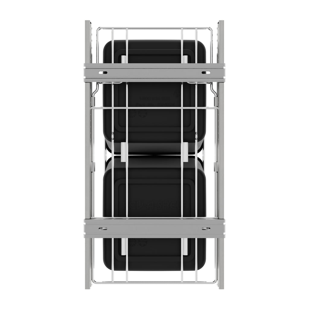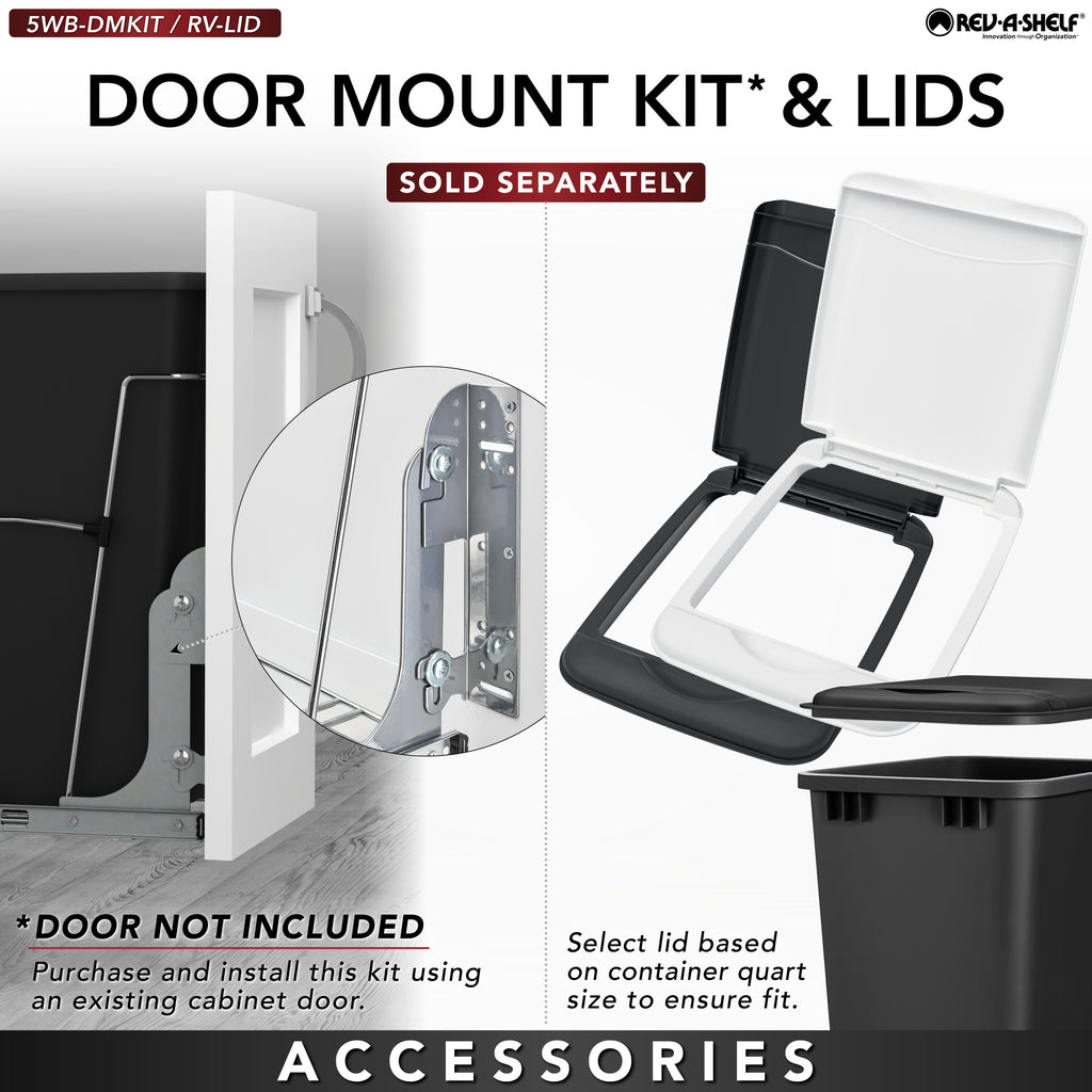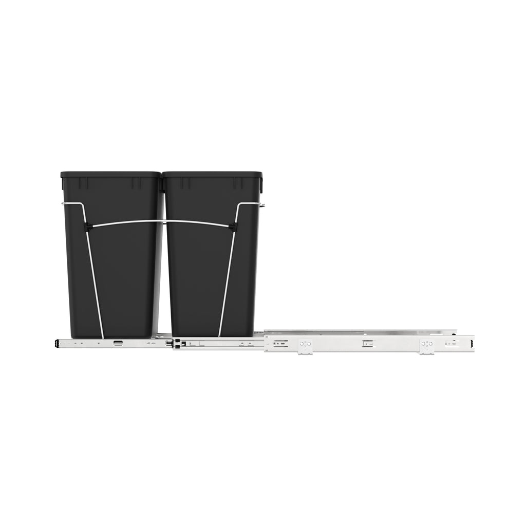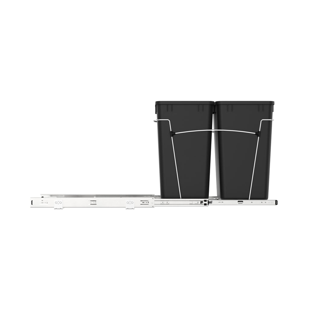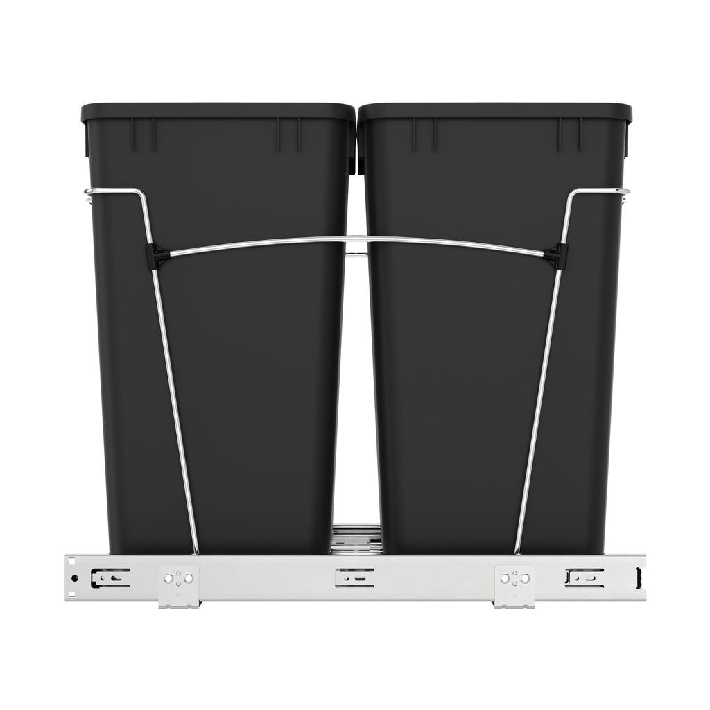 Rev-A-Shelf® knows waste containers better than anyone in our industry and the RV series is perfect for anyone wanting to replace your existing floor standing trash can and create more space in your kitchen. Available in chrome or white frames and offered in a variety widths and container sizes. All are easy to assemble and glide effortlessly on a sturdy slide system. Look for the optional door mount kit (5WB-DMKIT) or lids (27 qt., 32 qt., 35 qt. and 50 qt. only) that will surely finish your installation, but are not required for operation.. Included: (2) Black 27 qt. waste containers, (1) metal frame, (1) pair of slides, and mounting hardware