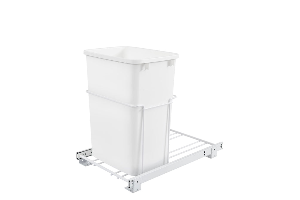 Rev-A-Shelf® knows waste containers better than anyone in our industry and the RV series is perfect for anyone wanting to replace your existing floor standing trash can and create more space in your kitchen. Available in chrome or white frames and offered in a variety widths and container sizes. All are easy to assemble and glide effortlessly on a sturdy slide system. Look for the optional door mount kit (5WB-DMKIT) and lids (27 qt., 32 qt., 35 qt. and 50 qt. only) that will surely finish your installation, but are not required for operation.. Included: (1) White 35 qt. waste container, (1) metal frame, (1) pair of slides, and mounting hardware