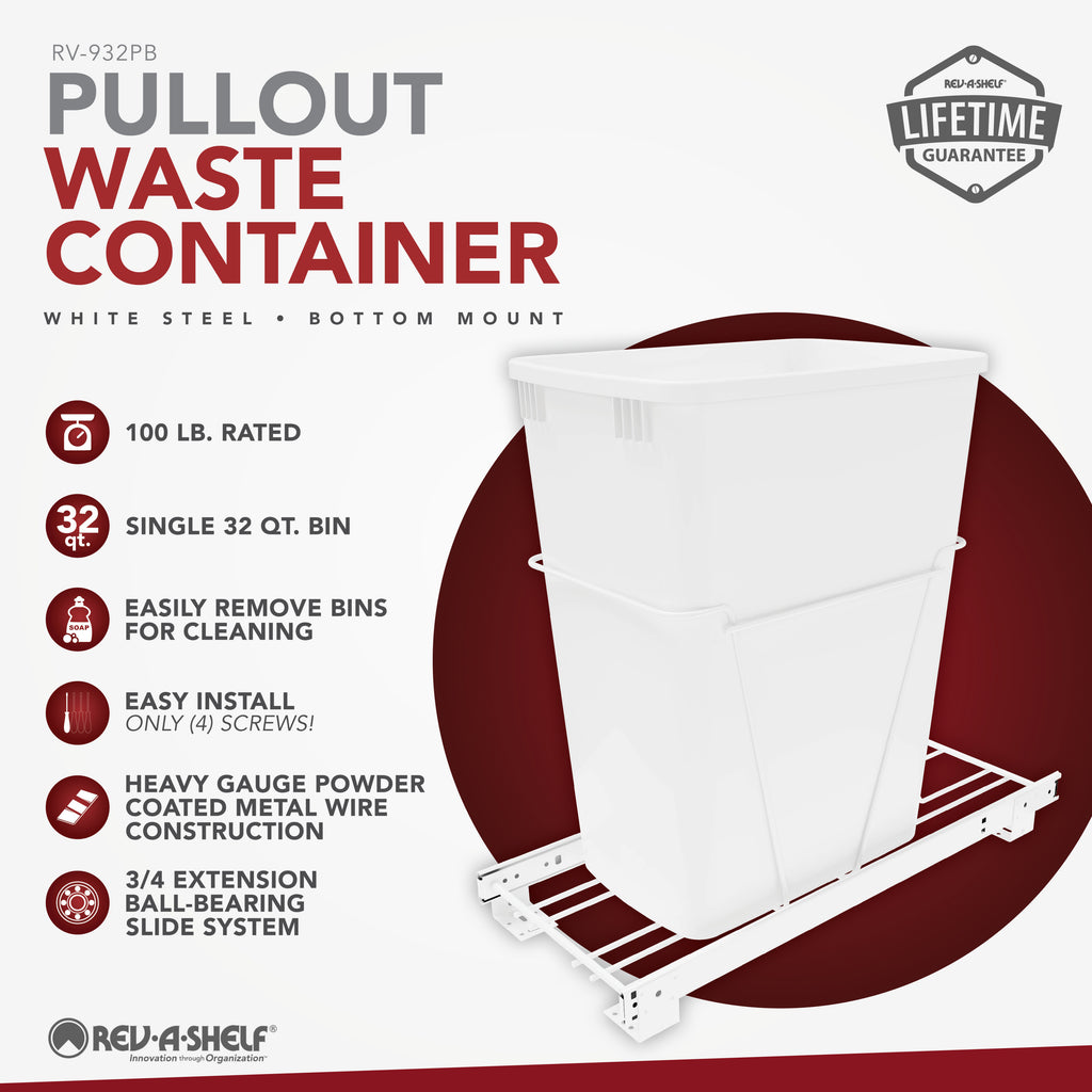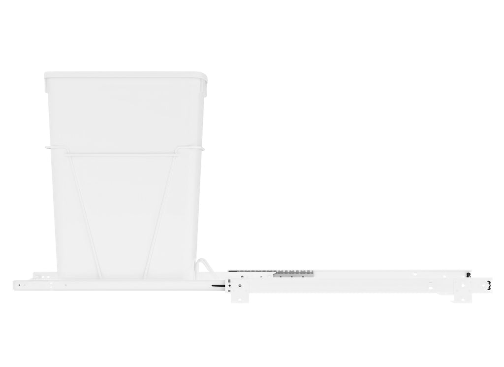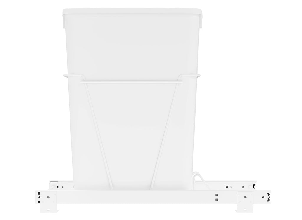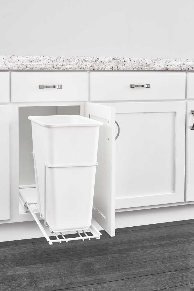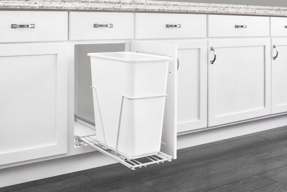 Rev-A-Shelf® knows waste containers better than anyone in our industry and the RV series is perfect for anyone wanting to replace your existing floor standing trash can and create more space in your kitchen. Available in chrome or white frames and offered in a variety widths and container sizes. All are easy to assemble and glide effortlessly on a sturdy slide system. Look for the optional door mount kit (5WB-DMKIT) and lids (27 qt., 32 qt., 35 qt. and 50 qt. only) that will surely finish your installation, but are not required for operation.. Included: (1) White 30 qt. waste container, (1) metal frame, (1) pair of slides, and mounting hardware