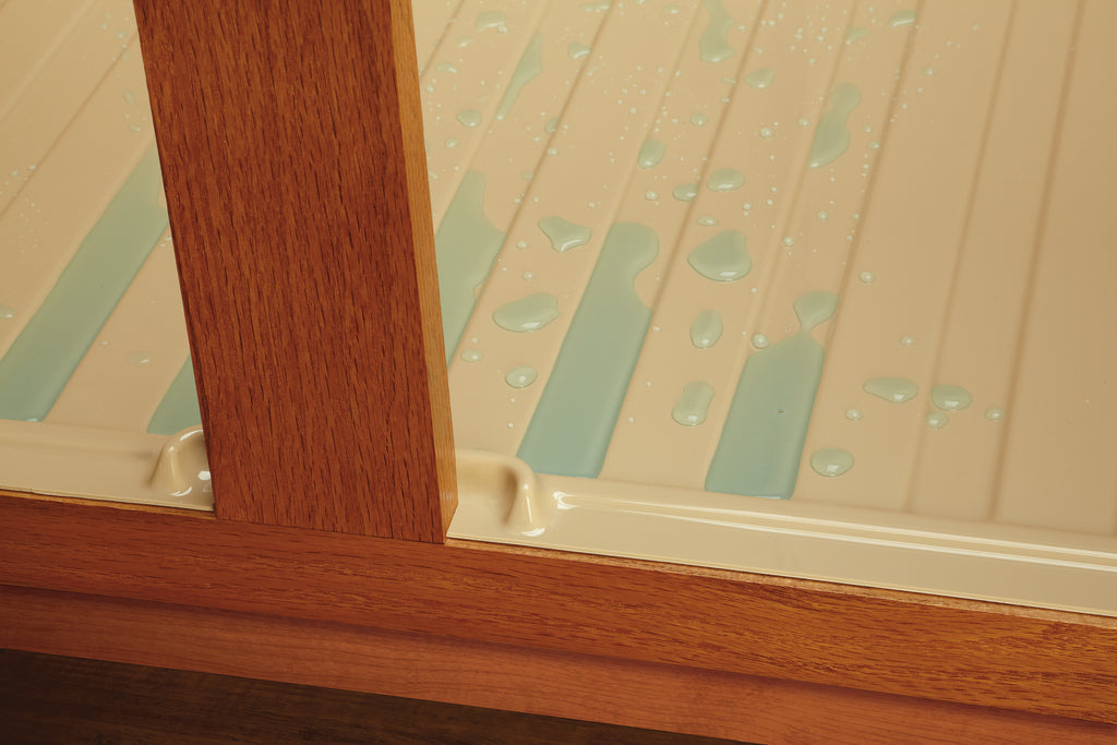 The SBDT is your first line of defense against under-sink cabinet damage from minor leaks. The unique design not only protects the bottom of your cabinet by holding water the tray actually funnels excessive water to the front of your cabinet and out onto the floor alerting you of the leak. The series is designed for installation in NEW cabinets from 27", 30", 33", 36", 39" and 42" sink base cabinet. They are easy clean up and resistant to most household chemicals. This product may require extra cuts or modification if installing into existing sink base cabinets where your plumbing is coming thru the floor, rather than the rear of the cabinet.. Included: (1) Almond drip tray