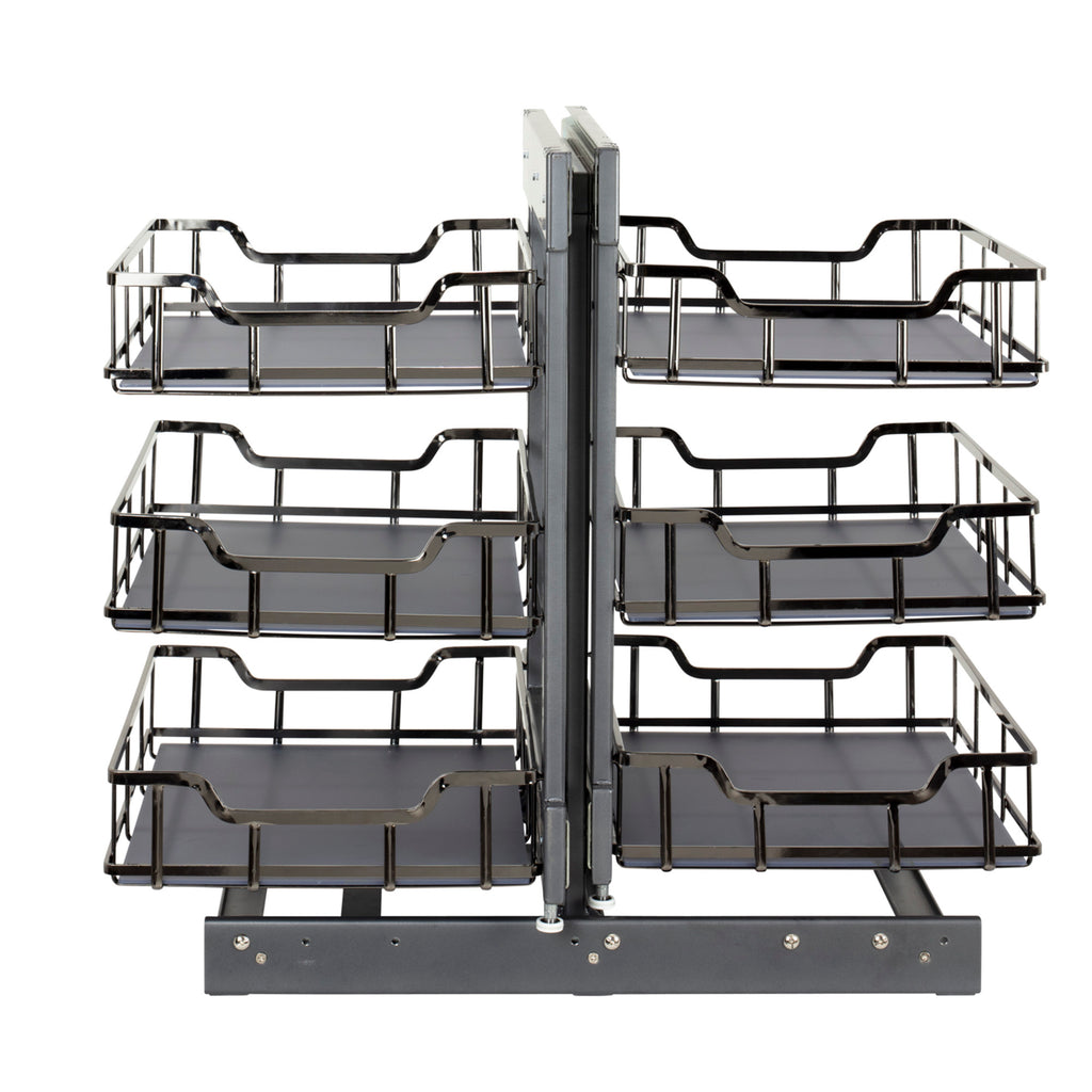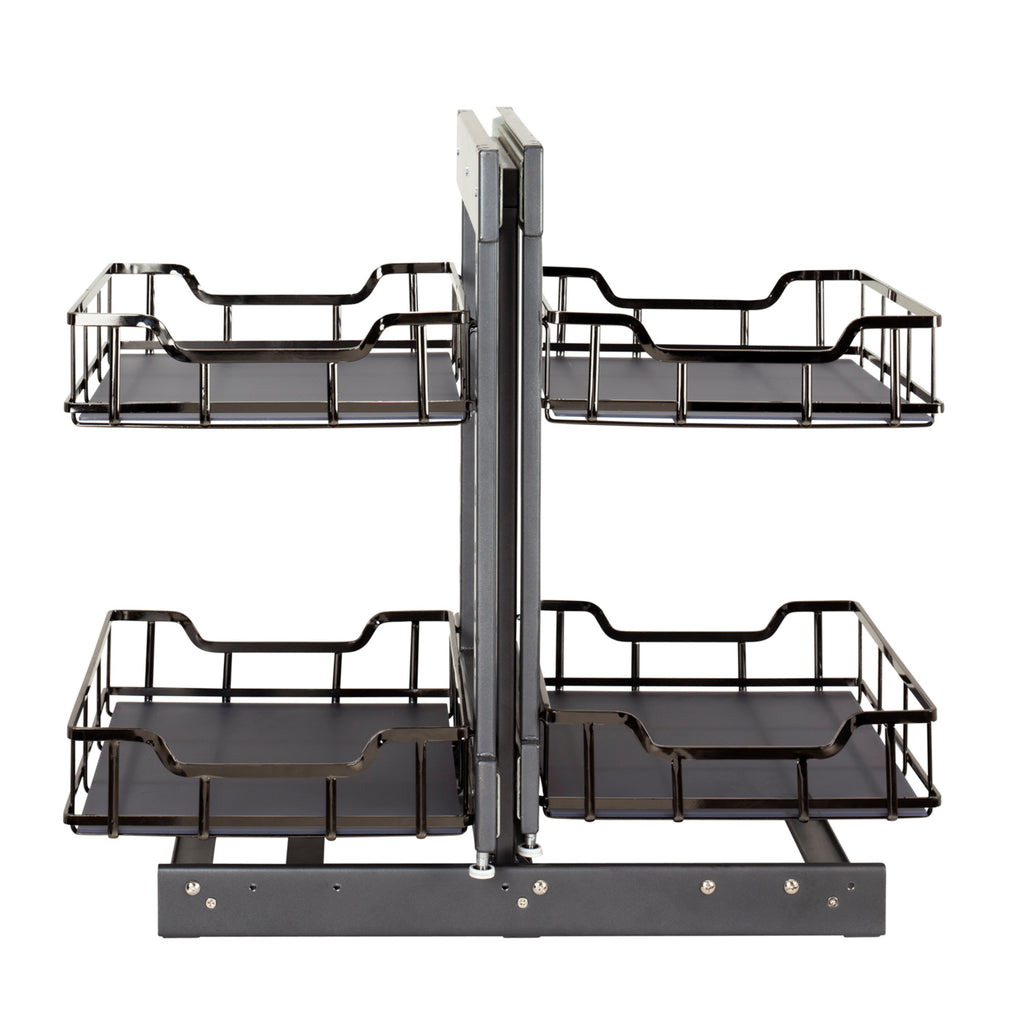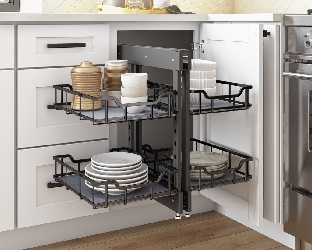 Bring style and functionality to your blind corner cabinet! Storage with Style's Blind Corner Organizer maximizes space in blind corner cabinets while allowing the user full accessibility to the entire unit as all four baskets extend out of the cabinet for full access. This blind corner organizer is designed to fit most 48" full-height blind corner cabinets and features acrylic liners for a smooth shelf bottom that is also easy to clean. Extra clearance is built in to prevent interference with adjacent hardware when fully extended out of the cabinet. Soft-close ball-bearing slides and heavy duty materials making it durable, stable and stylish. The unit is easy to assemble and installs for either left or right-handed applications. Add an extra set of baskets to make a 3-tier shelf organizer. Black Nickel finish. To view available specifications and installation instructions select all product options., Bring style and functionality to your blind corner cabinet! Storage with Style's Blind Corner Organizer maximizes space in blind corner cabinets while allowing the user full accessibility to the entire unit as all four baskets extend out of the cabinet for full access. This blind corner organizer is designed to fit most 48" full-height blind corner cabinets and features acrylic liners for a smooth shelf bottom that is also easy to clean. Extra clearance is built in to prevent interference with adjacent hardware when fully extended out of the cabinet. Soft-close ball-bearing slides and heavy duty materials making it durable, stable and stylish. The unit is easy to assemble and installs for either left or right-handed applications. Add an extra set of baskets to make a 3-tier shelf organizer. Black Nickel finish., Soft-close slides, Smooth, stable movement, All four baskets extend out of the cabinet, Coordinates with other Storage with Style organizers, Clearance for adjacent hardware, , , ,