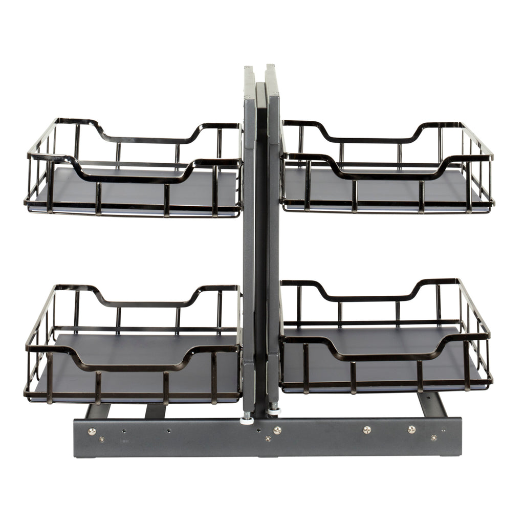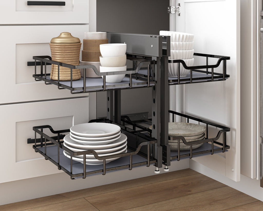 Bring style and functionality to your blind corner cabinet! Storage with Style's Blind Corner Organizer maximizes space in blind corner cabinets while allowing the user full accessibility to the entire unit as all four baskets extend out of the cabinet for full access. This blind corner organizer is designed to fit most 48" door/drawer blind corner cabinets and features acrylic liners for a smooth shelf bottom that is also easy to clean. Extra clearance is built in to prevent interference with adjacent hardware when fully extended out of the cabinet. Soft-close ball-bearing slides and heavy duty materials making it durable, stable and stylish. The unit is easy to assemble and installs for either left or right-handed applications. Black Nickel finish. To view available specifications and installation instructions select all product options., Bring style and functionality to your blind corner cabinet! Storage with Style's Blind Corner Organizer maximizes space in blind corner cabinets while allowing the user full accessibility to the entire unit as all four baskets extend out of the cabinet for full access. This blind corner organizer is designed to fit most 48" door/drawer blind corner cabinets and features acrylic liners for a smooth shelf bottom that is also easy to clean. Extra clearance is built in to prevent interference with adjacent hardware when fully extended out of the cabinet. Soft-close ball-bearing slides and heavy duty materials making it durable, stable and stylish. The unit is easy to assemble and installs for either left or right-handed applications. Black Nickel finish., Soft-close slides, Smooth, stable movement, All four baskets extend out of the cabinet, Coordinates with other Storage with Style organizers, Clearance for adjacent hardware, , , ,