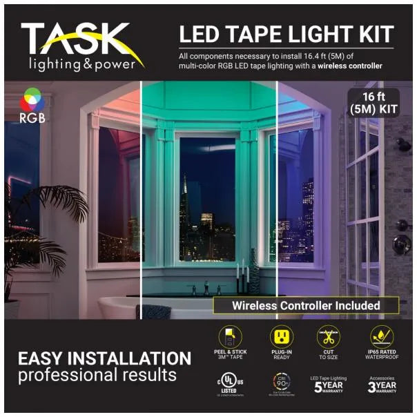 Everything needed to install 1 zone and 1 area of 16 ft of Multi-Color RGB tape lighting with a wireless one-zone RGB controller in one box. Contains 16 ft roll of Multi-Color RGB tape with 3M Ultra Bond double-stick tape for peel-and-stick installation, six RGB wire-to-tape connectors, plug-in 60W power supply, 25 ft connection wire, one-zone wireless RGB controller, wireless RGB receiver, female barrel plug, screwdriver, adhesive promoter wipe. Cut the tape light to length to achieve beautiful, color-changing lighting in any space.