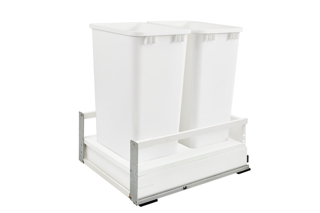 Rev-A-Shelf® brings you another complete waste container designed for base cabinets. They come preassembled with TANDEMBOX and heavy-duty full-extension soft-close slide system. The sleek look is sure to impress.. Included: (2) White 50 qt. waste containers, (1) metal frame, (1) pair of slides, mounting hardware, and Door-Mount brackets