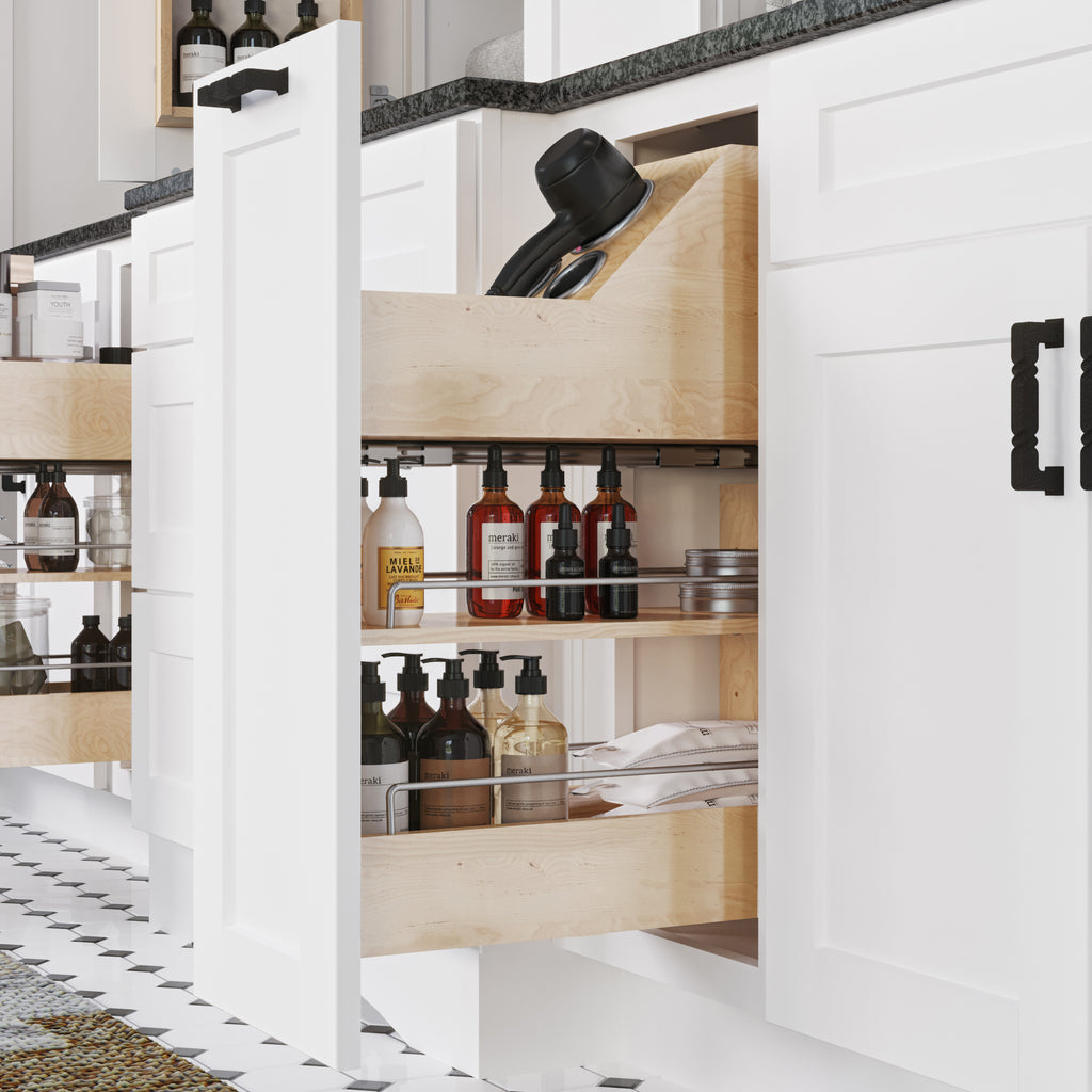 Convert a "No Wiggle" 8" Vanity Cabinet Pullout into a versatile grooming organizer with this insert designed to store a hair dryer and two other hair appliances. Stainless steel canisters with heatshield ensures no damage to the wood pullout. Insert just drops into the vanity pullout and requires a full door application. To view available specifications and installation instructions select all product options., Convert a "No Wiggle" 8" Vanity Cabinet Pullout into a versatile grooming organizer with this insert designed to store a hair dryer and two other hair appliances. Stainless steel canisters with heatshield ensures no damage to the wood pullout. Insert just drops into the vanity pullout and requires a full door application., Simple drop-in design, Requires full door application, #8 flat head screws included, , , , , ,